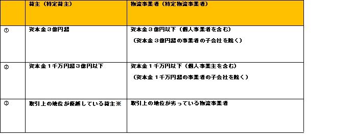 また、荷主が物流事業者に対して、継続的に物品の運送又は保管を委託している場合において、荷主及び物流事業者の資本金や取引上の地位が、物流特殊指定が定めるいずれかの関係にあるときは、それぞれ特定荷主及び特定物流事業者として、物流特殊指定の適用対象となります。