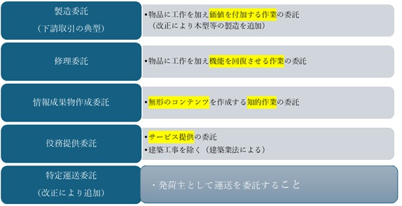 現行の下請法では、適用される取引として、従前の製造委託・修理委託・情報成果物作成委託、役務提供委託が定められていました。