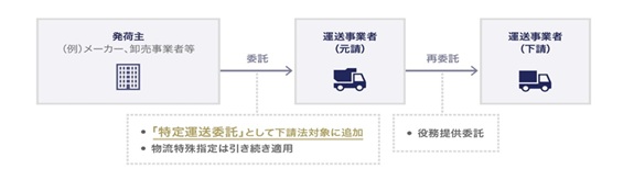 これに対し、取適法では、「特定運送委託」という新たな委託類型が追加され、発荷主から運送事業者への一定の委託も適用対象となります(取適法2条5項)。